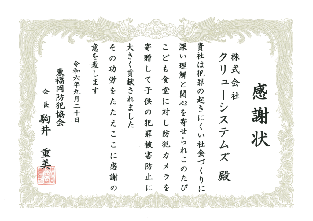 2024.09.24 福岡県のこども食堂2箇所にPOLICENETを寄贈 感謝状を受領。福岡県東警察署が見守り、地域の安全... この度、東福岡防犯協会より、地域の安全に寄与したとして感謝状を受領いたしました。 一覧へ戻る