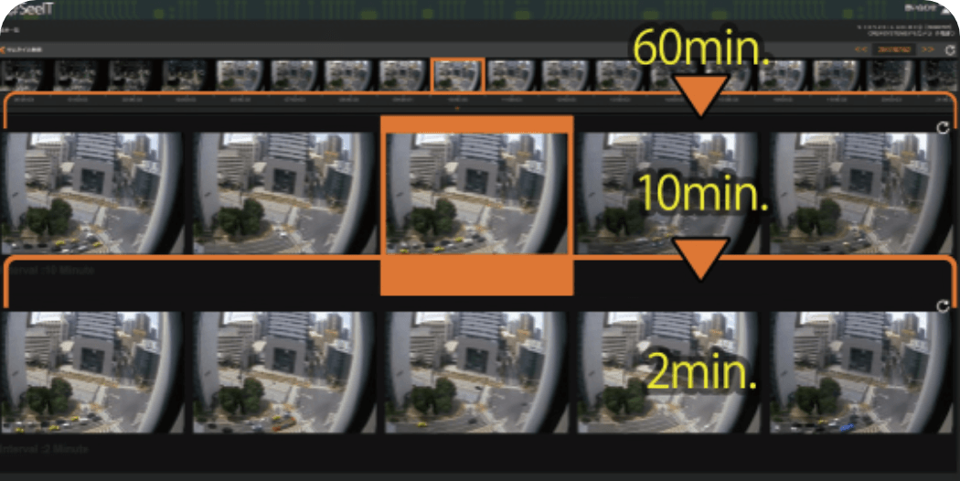 確認したい映像をすぐに見つけられる、階層サムネイル検索機能を実装しました。 サムネイルの間隔を、例えば1時間毎→10分毎→2分毎と3段階に絞り込むことで、これまでのように早戻したり、早送りしたりする手間なく、素早く目的の映像にたどり着くことができます。